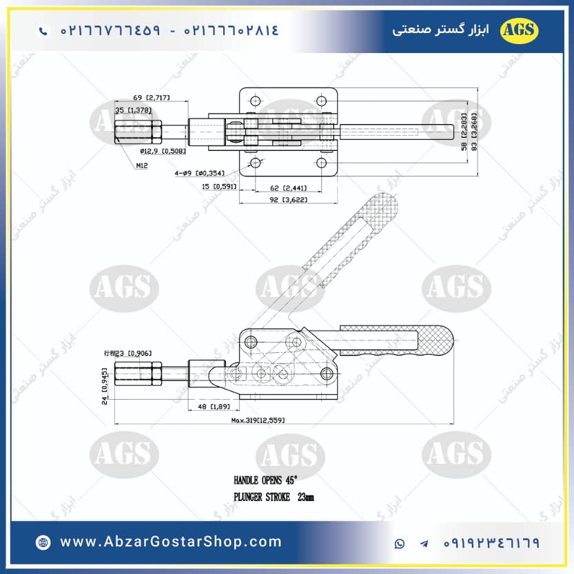 • زاویه باز شدن دسته: 45 درجه